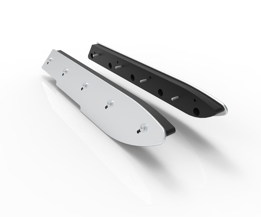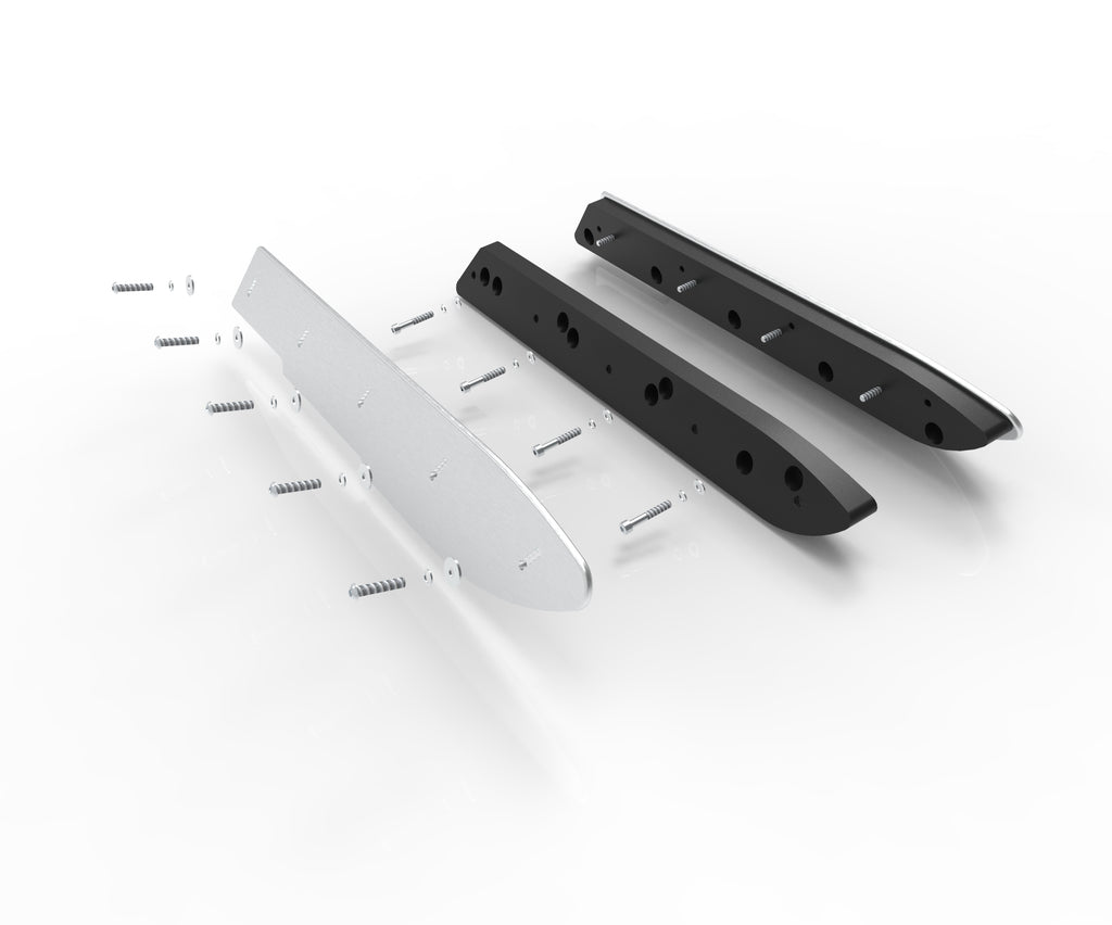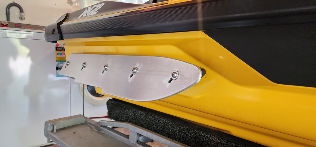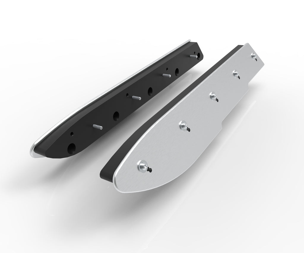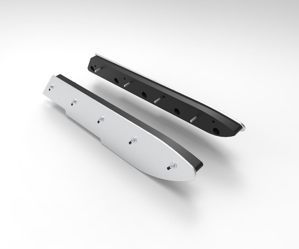 CNC machined bolsters from repro-black UHMWPE. Fins are CNC waterjet cut from 8.0mm 5083 aluminium.....supplied raw finish, with machine rounded edges. 5 adjustment levels, to tune to the conditions & your riding style.